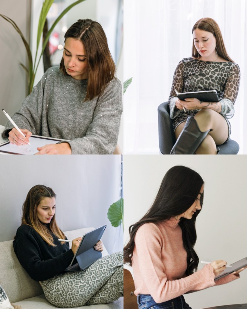 Cuatro artistas, cuatro estilos. Destacamos por la delicadeza y la línea fina, pero cada artista tiene su propio estilo para que puedas elegir cuál encaja más contigo.